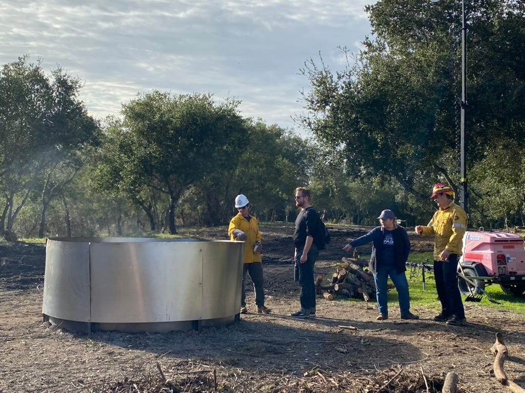 CalFire has been pioneering the use of mobile biochar kilns to mitigate fire risk for several years. In 2024, I visited a site in the Berkeley Hills where a forest service contract with Biochar on Site [https://donorbox.org/biochar-on-site] was demonstrating how to thin highly flammable eucalyptus in a State Forest by turning it into biochar. Broadcast back onto the forest floor, the biochar worked like a sponge when it rained, arresting surface erosion, percolating water towards tree roots, and storing excess for a later season when the trees would need to endure the drying heat of the Santa Ana winds.